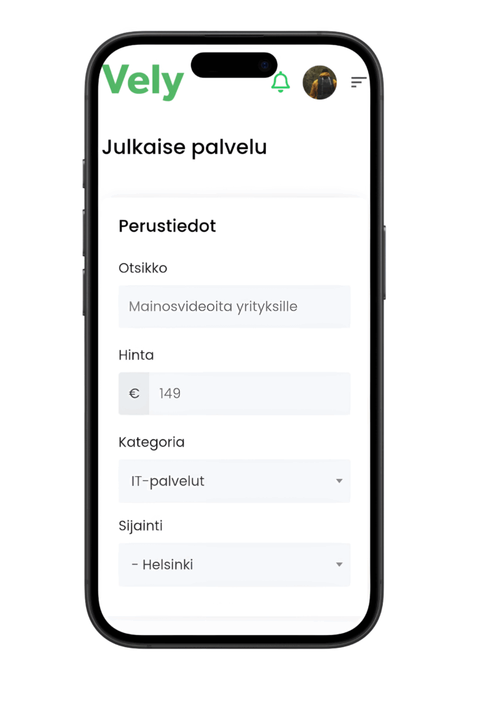 Vely on Suomen monipuolisin tehtävien ja palveluiden markkinapaikka. Turvallinen, helppo ja nopea tapa löytää apua tai tarjota taitojasi.